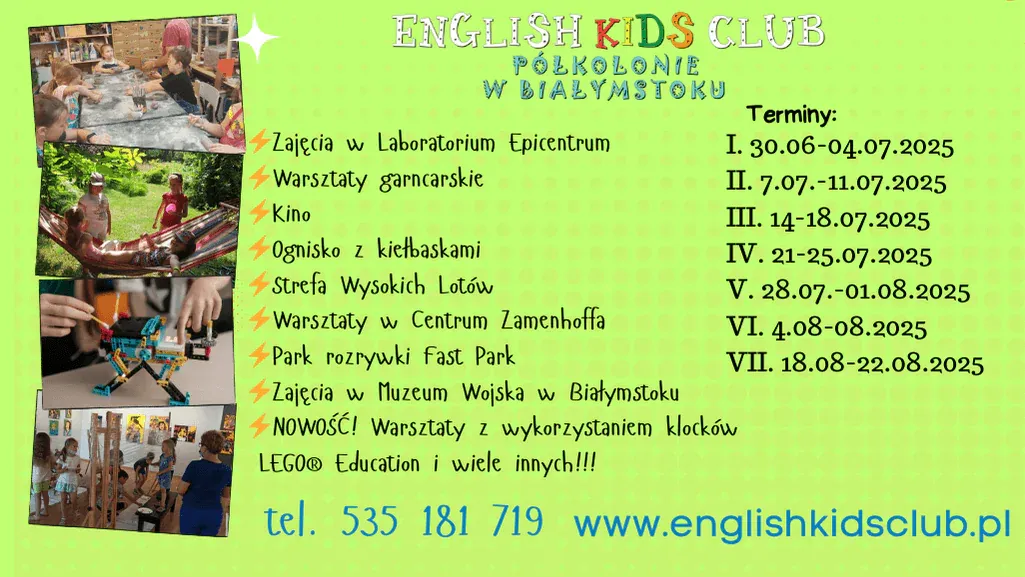 ? Lato zbliża się wielkimi krokami! Masz już plany na wakacje? Jeśli nie, mamy dla Ciebie świetną opcję – półkolonie letnie w English Kids Club! To doskonała okazja, by połączyć dobrą zabawę z nauką, nawiązać nowe znajomości i aktywnie spędzić czas. Pod opieką doświadczonych instruktorów dzieci będą uczestniczyć w ciekawych zajęciach, inspirujących warsztatach, ekscytujących wycieczkach i wielu innych atrakcjach. Nie zwlekaj – zapisz swoje dziecko już dziś i podaruj mu wakacje pełne radości i niezapomnianych wrażeń! ??️